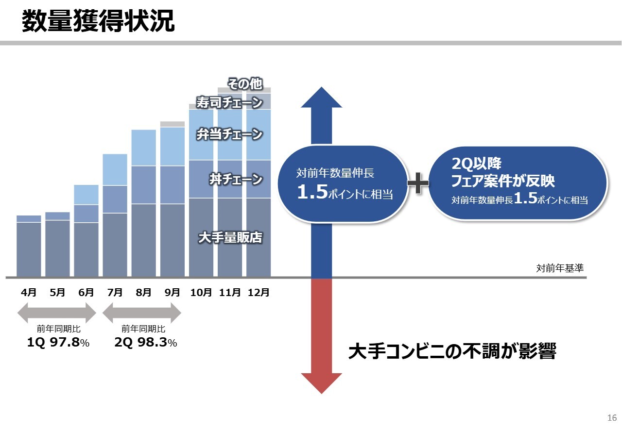特に直近で悪化しているのは、コンビニエンスストアです。大手コンビニエンスストアの販売数量は前年同期比90パーセント台前半となっており、これが大きく影響しています。