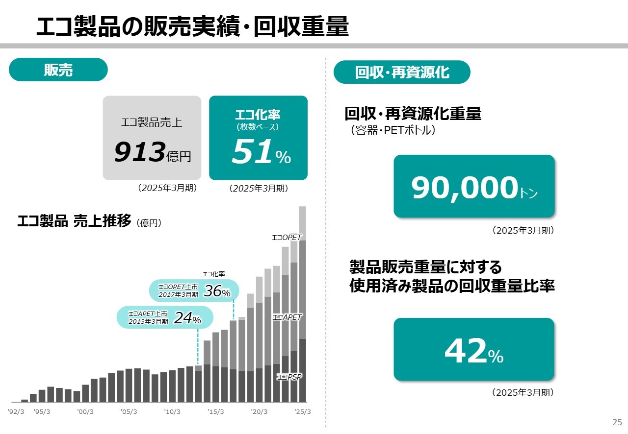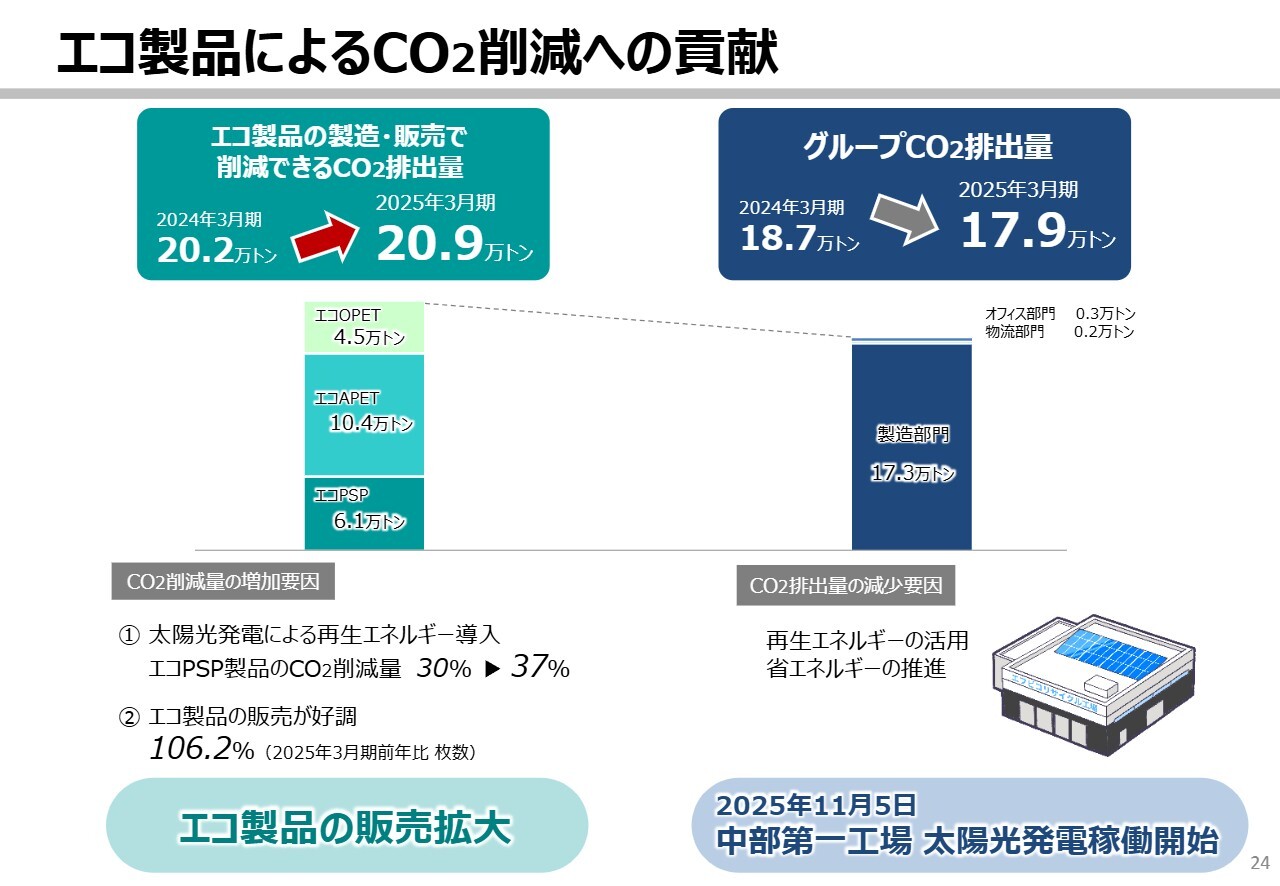 エコ製品による年間CO2削減量についてです。エコ製品では、バージンの原料と比較して、CO2がPSP容器で37パーセント、APET・OPETで30パーセント削減されます。当社がエコ製品を製造・販売することにより、Co2排出量の削減が年間で20万トンを超えました。