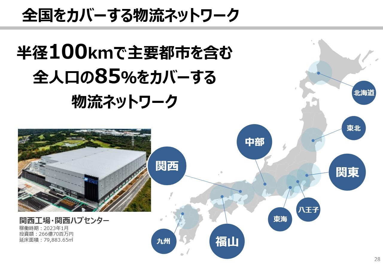 エフピコグループのインフラ活用についてです。関西に配送センターを設置したことで、全国の拠点配送センターから半径100キロの円を描くと人口の85パーセントをカバーする物流ネットワークが完成しました。