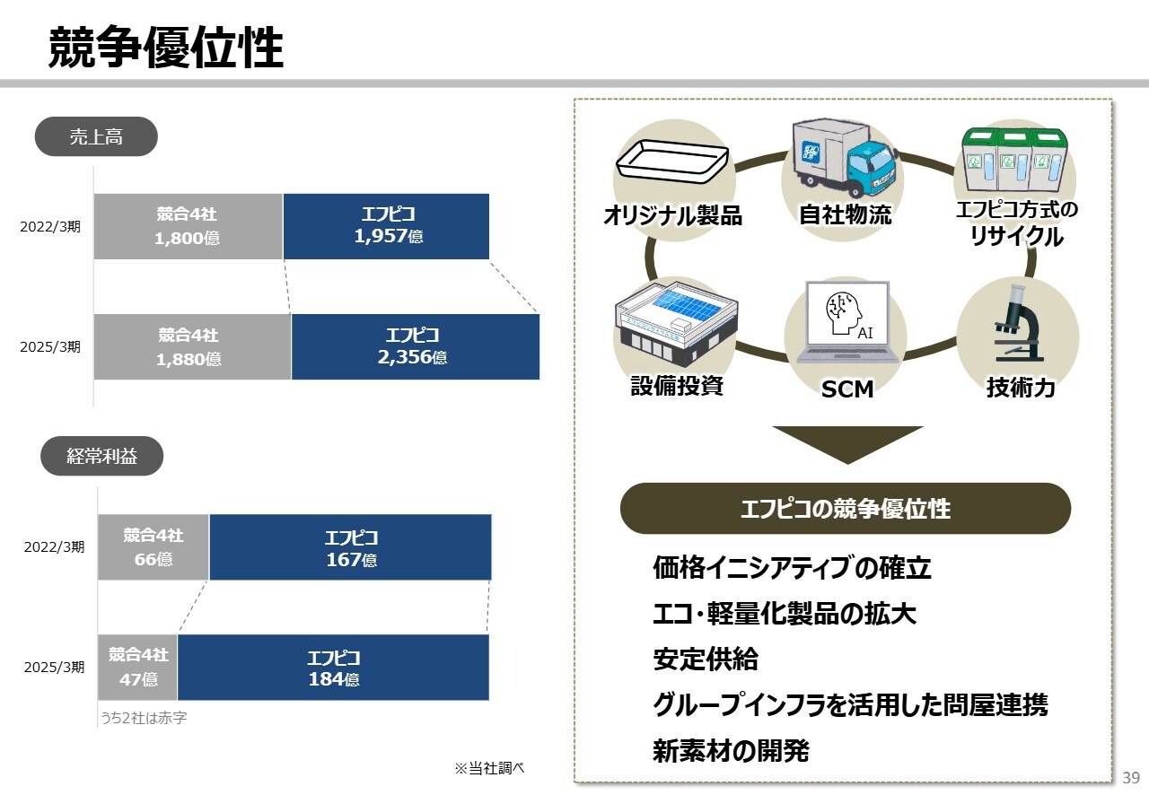 競争優位性についてです。スライドのグラフは、大手5社と呼ばれる、当社と他の4社の2022年3月期と2025年3月期の、売上・利益の変化を比較しています。わずか3年間でこれほどの差が生じています。