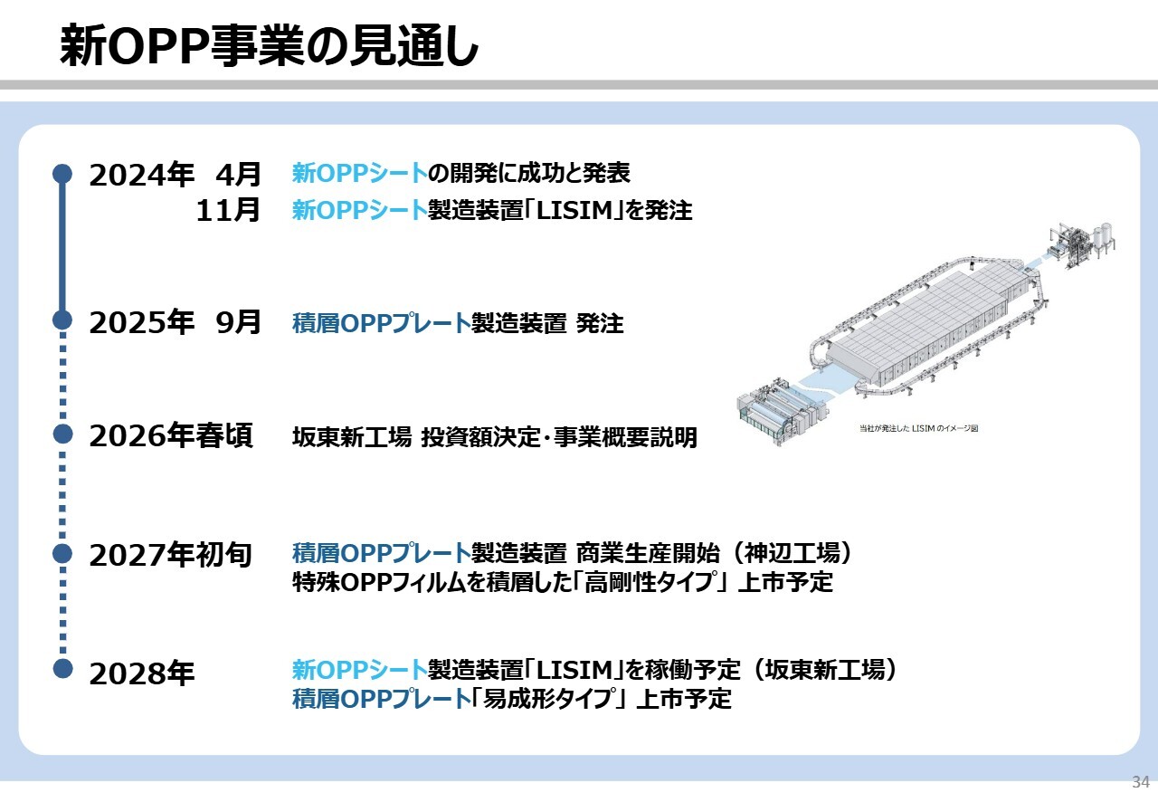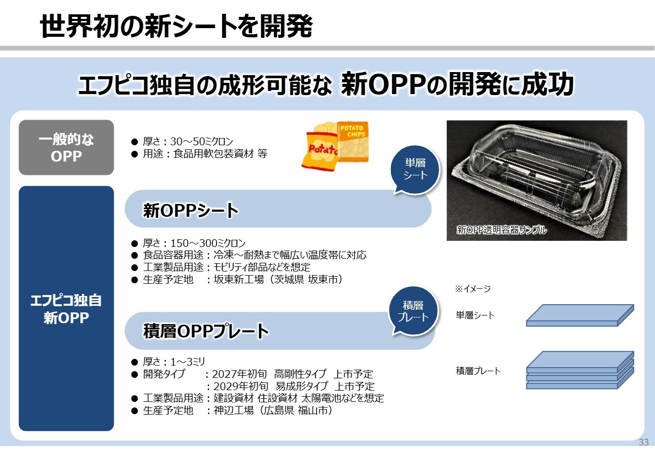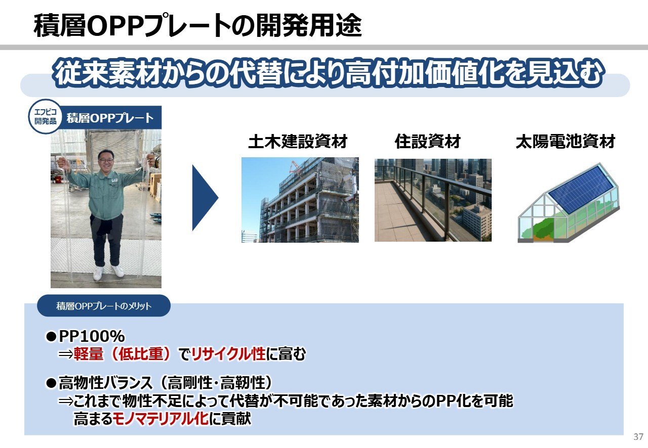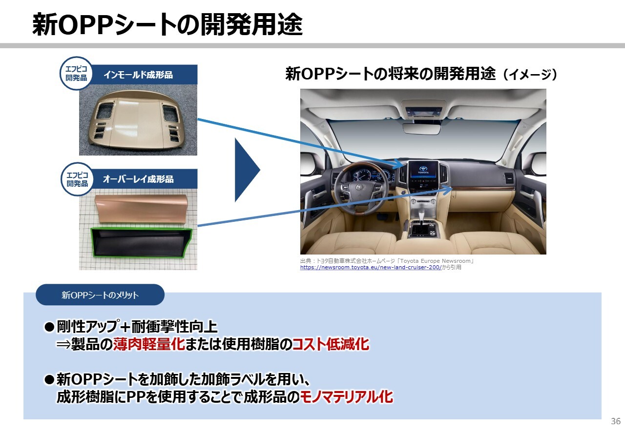 小川浩嗣氏:専務取締役商事本部本部長の小川です。新OPPシートの開発状況について補足します。この会場にはサンプルを並べていますが、シートに関してはモビリティを中心とした加飾フィルムを現在研究開発中です。