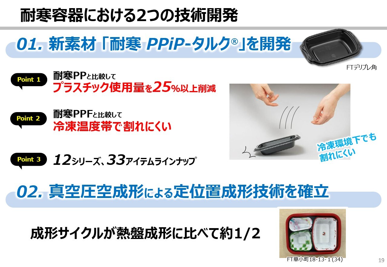 冷凍製品において一番の問題は、落下時に容器が割れることです。この技術では、割れにくさが特徴であるとともに、プラスチックの使用量を削減する効果もあります。