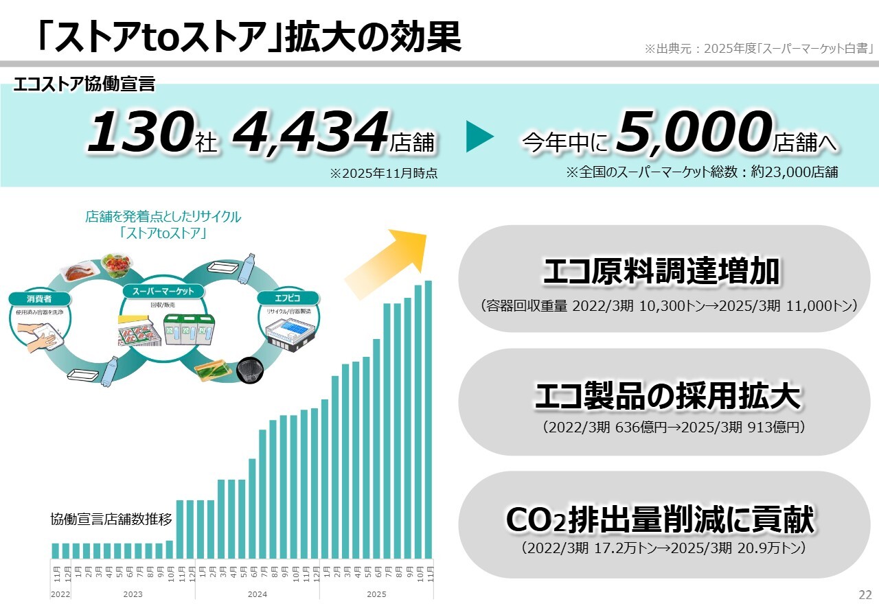 スーパーマーケットの使用実績に基づき、どの程度そのスーパーマーケットがCO2削減に貢献したかを算出しています。目標値を掲げ、「CO2削減をさらに広げ、大きくしよう」という趣旨で、各社と協働宣言を行っています。