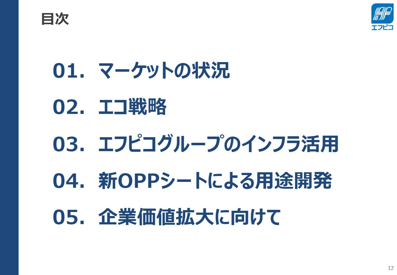 佐藤守正氏:代表取締役会長兼エフピコグループ代表の佐藤です。お忙しいところお集まりいただき、誠にありがとうございます。「企業価値拡大に向けて」というテーマで、目次の順にお話しします。