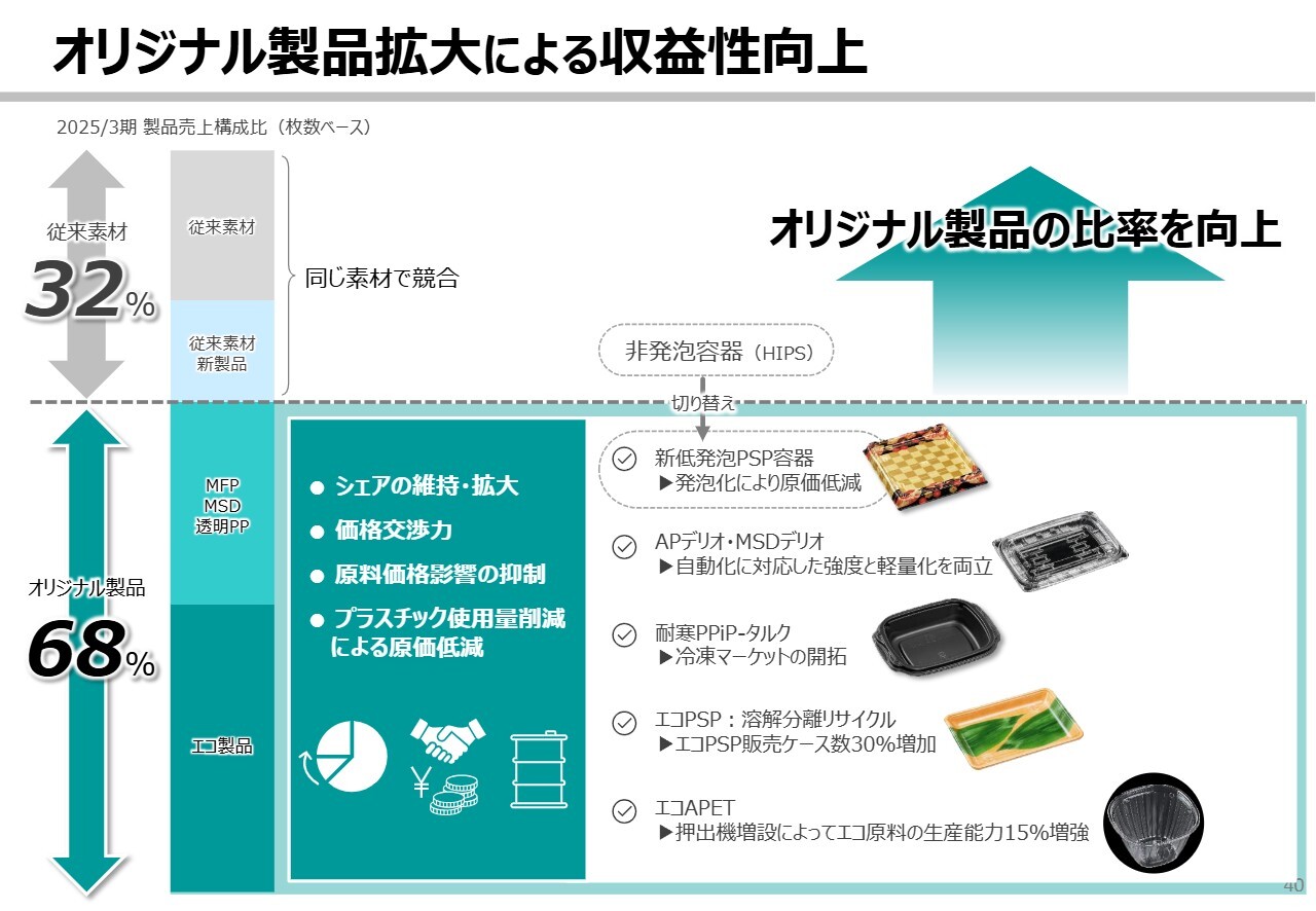 私どもが販売している製品のうち、エコ製品を含めて、他社では製造できない製品の比率は現在68パーセントです。同業他社が同じ素材で作ることができる製品の比率は32パーセントにとどまっています。