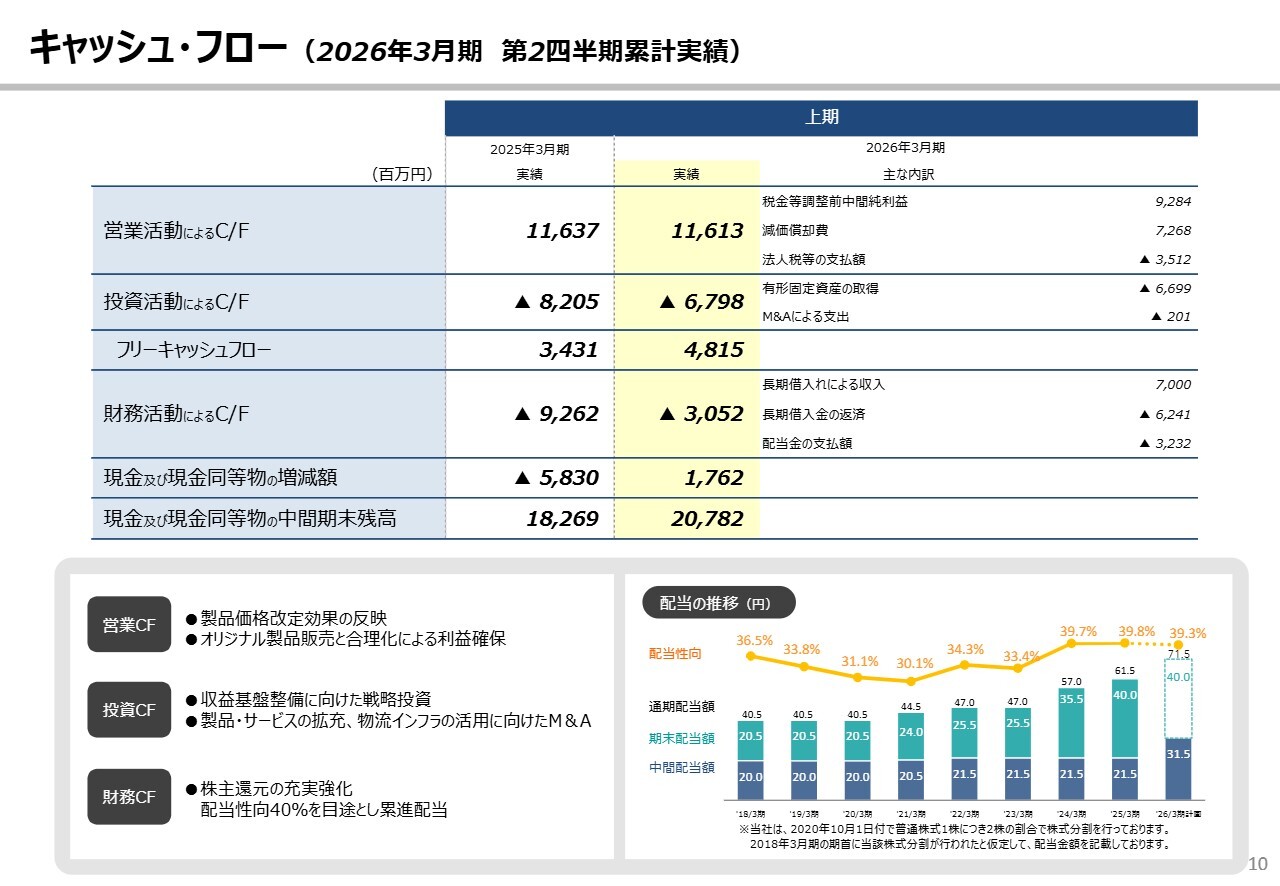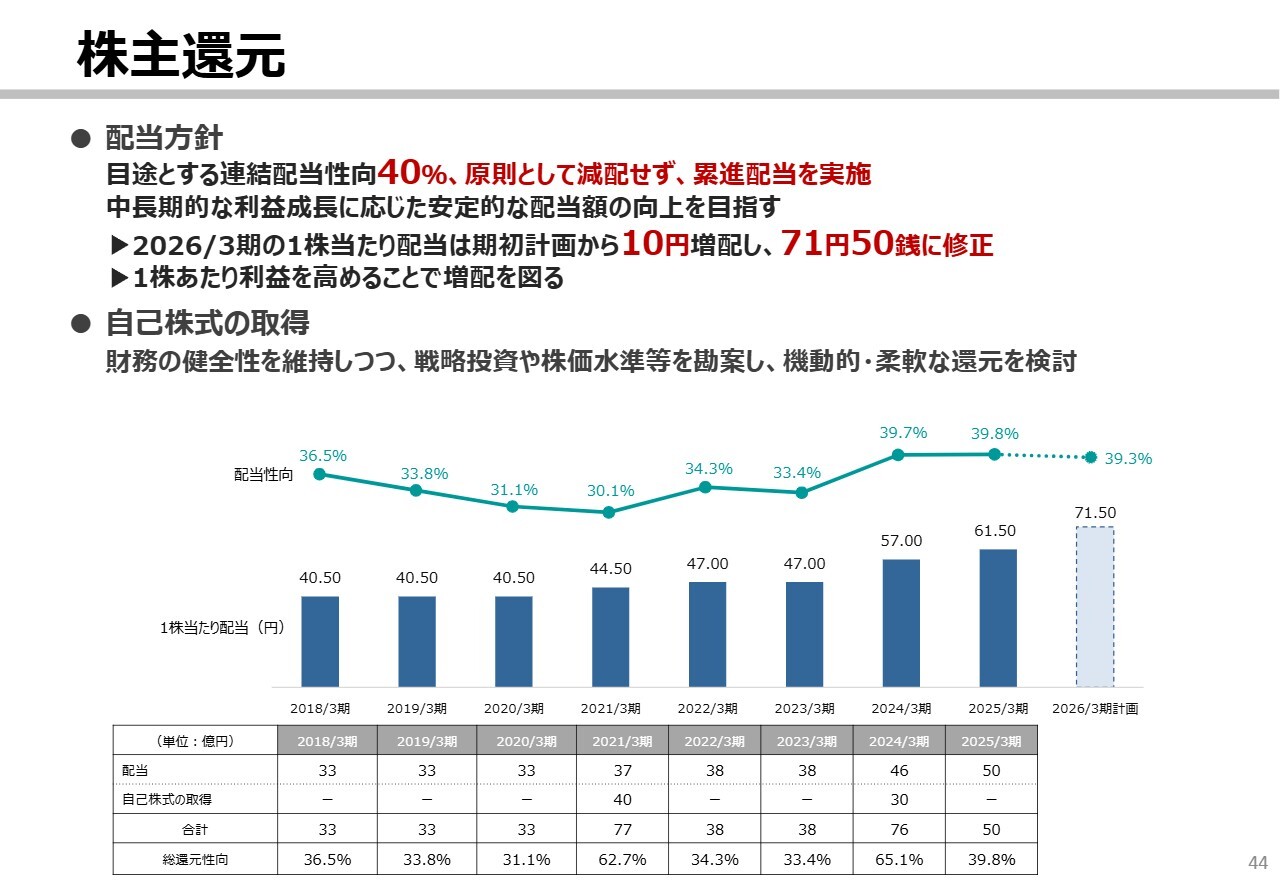 配当については、今回10円増配し、配当性向40パーセントとし、累進配当を進めていく方針です。