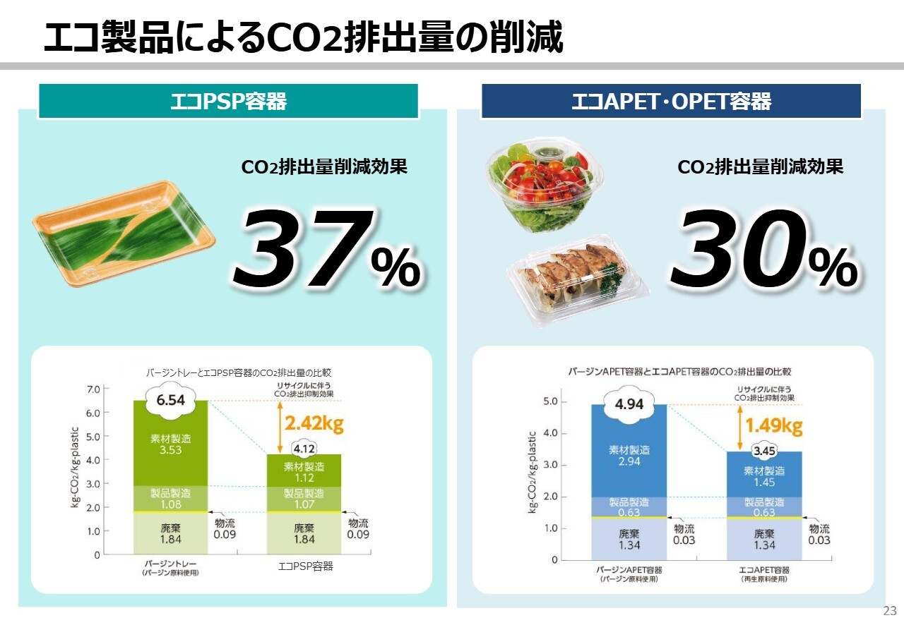 エコ製品によるCO2排出量の削減についてです。エコ製品は、バージンの原料を使用して製造する場合と比較して、CO2がPSP容器で37パーセント、APET・OPETで30パーセント削減されます。