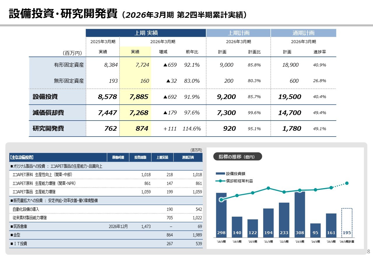 設備投資は、エコ製品の生産性向上や能力の増強、自動化投資を中心に、計画92億円に対して78億8,500万円、減価償却費は計画73億円に対して72億6,800万円となりました。設備投資の通期計画に変更はありません。