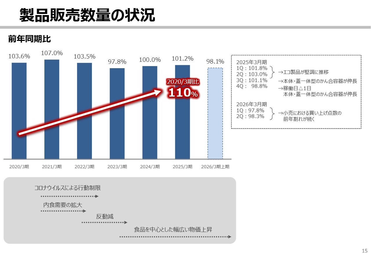 製品売上数量は、物価高を背景に小売における買い上げ点数が前年を下回った影響を受け、前期比98.1パーセントとなりました。
