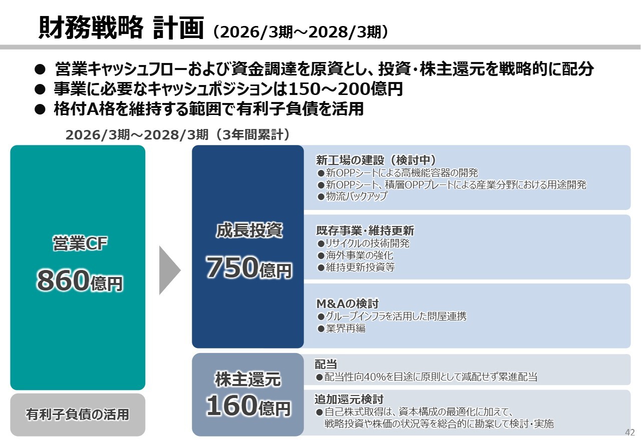 営業キャッシュ・フローは、価格改定の効果もあり、安定して推移しています。獲得したキャッシュを原資に、将来に向けた成長投資を実行し、海外戦略や新OPPの用途開発など、多様化を図っていきます。