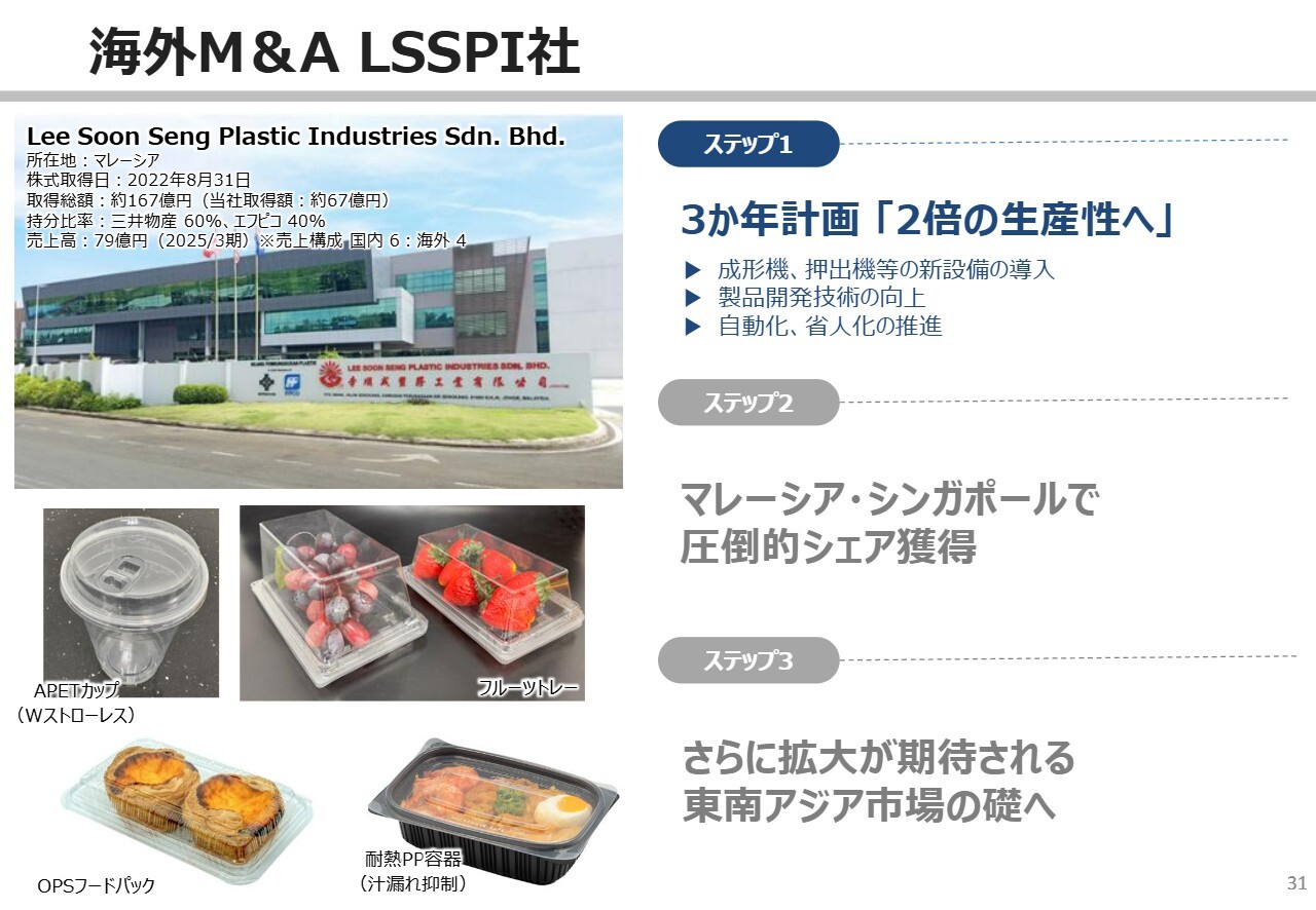 海外では、マレーシアのLSSPI社を三井物産と共同でM&Aしました。持ち分比率は、三井物産が60パーセント、当社が40パーセントです。