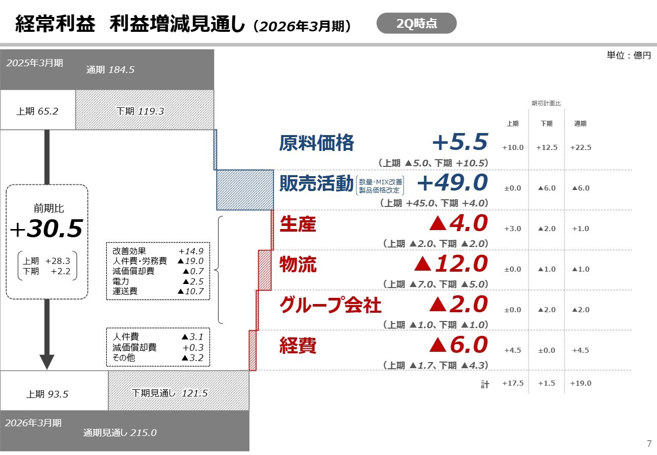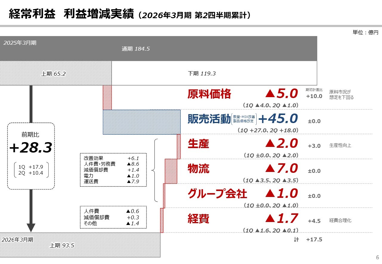 上半期計画比では、17億5,000万円上回りました。その主な要因は、原料価格の高値が続く中でも期初想定を下回って推移したことにより10億円、生産性の向上が3億円、合理化による経費上昇の抑制が4億5,000万円となっています。