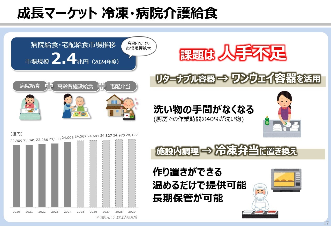 一方で、新しいマーケットが生まれつつあります。病院食を365日3食、チルドの状態で提供するのは、非常に困難になってきています。