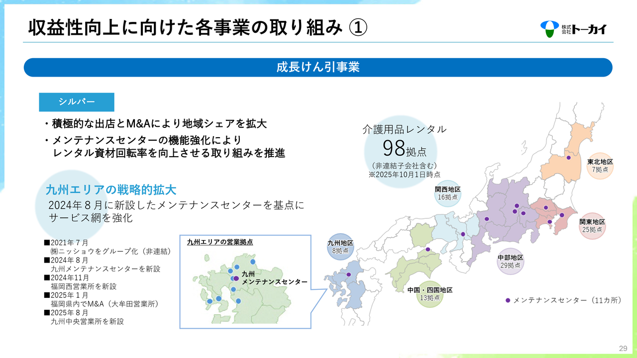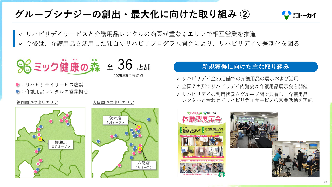 また、介護用品レンタルでは、2024年7月にグループ化したmik japanが展開しているリハビリデイサービス「ミック健康の森」と商圏が重なるエリアで、相互営業を推進しています。