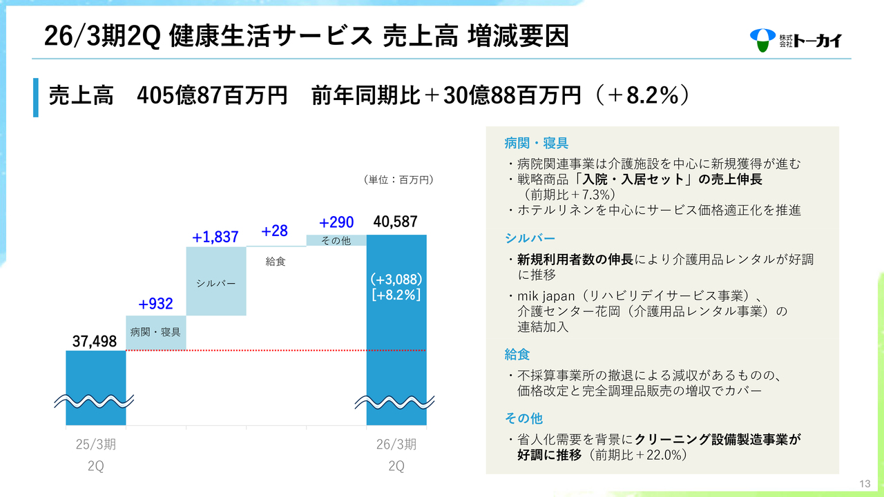 それでは、セグメント別の業績について説明します。健康生活サービスの売上高は前年同期比8.2パーセント増の405億8,700万円となりました。病院関連事業および寝具・リネンサプライ事業は、9億3,200万円の増収となりました。