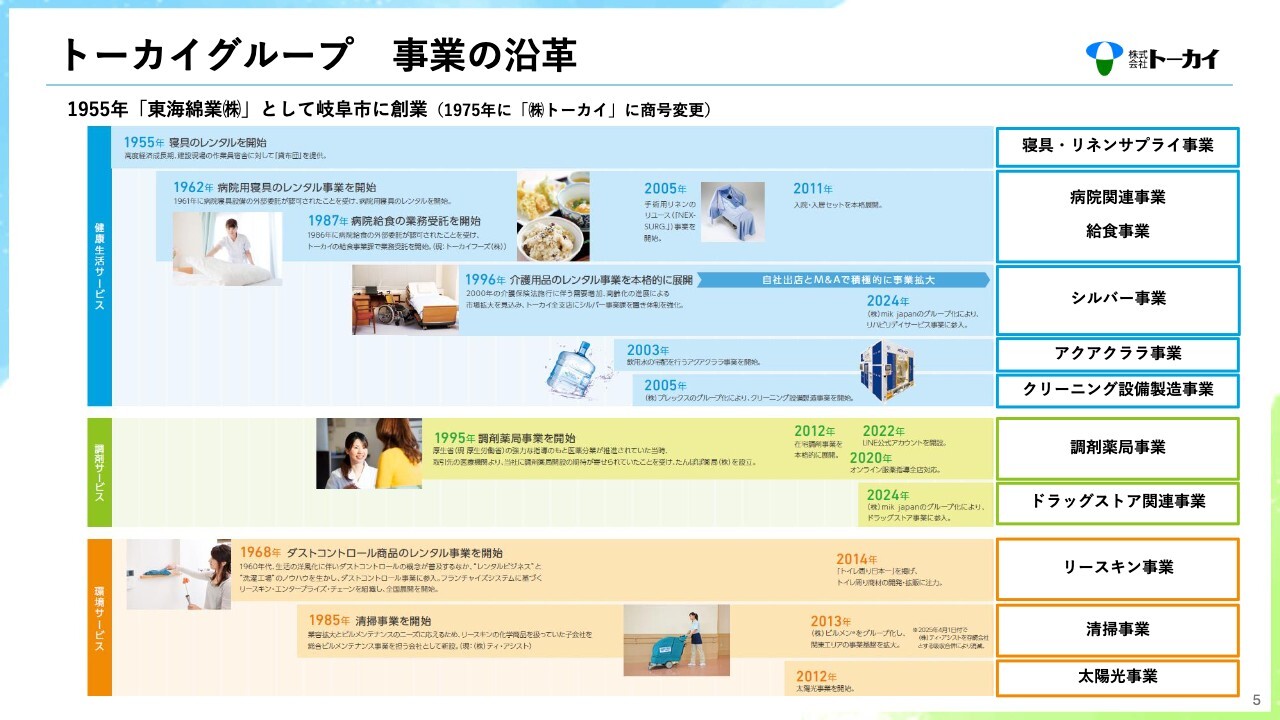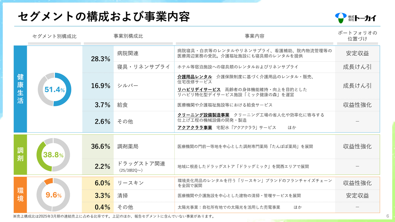 決算説明に入る前に、トーカイグループの概要について簡単にご説明します。当社グループは、「清潔と健康」をテーマに、人々の快適な暮らしと安全で健康的な生活を支えるサービスを提供しています。スライドのとおり、「医療と介護の現場」「高齢者の自立した生活」「地域の皆さまの健康」「日々の清潔な暮らし」を支える事業を推進することで、社会に貢献しています。