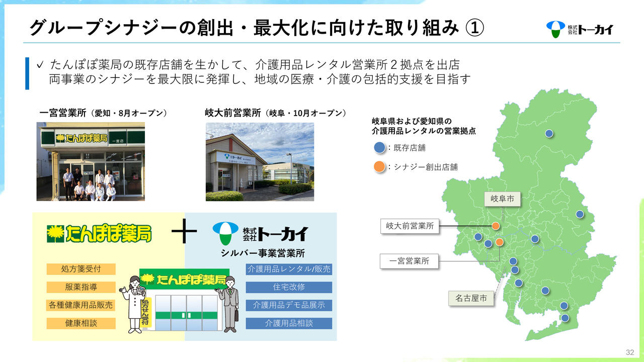 その具体策の1つとして、たんぽぽ薬局の既存店舗を活用した介護用品レンタル事業の出店を進めています。8月には愛知県のたんぽぽ薬局一宮店での併設、10月には岐阜大学医学部附属病院の門前に位置するたんぽぽ薬局の隣地に営業所を出店しました。
