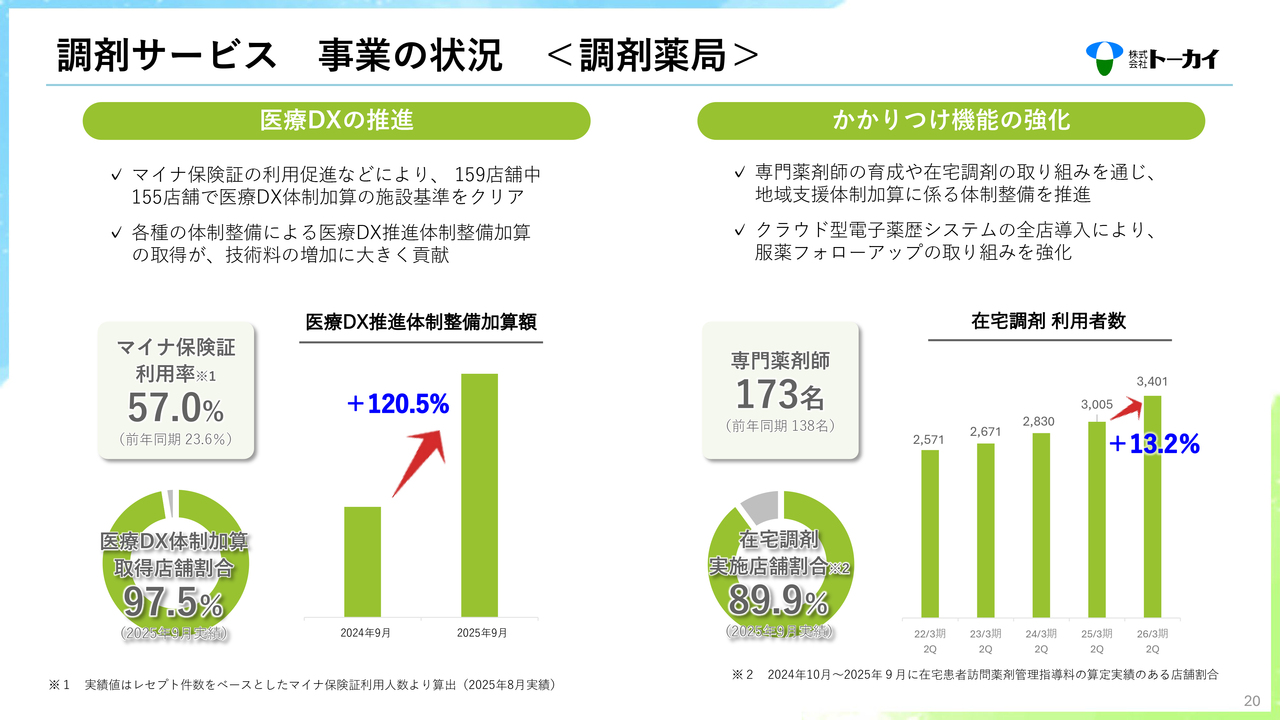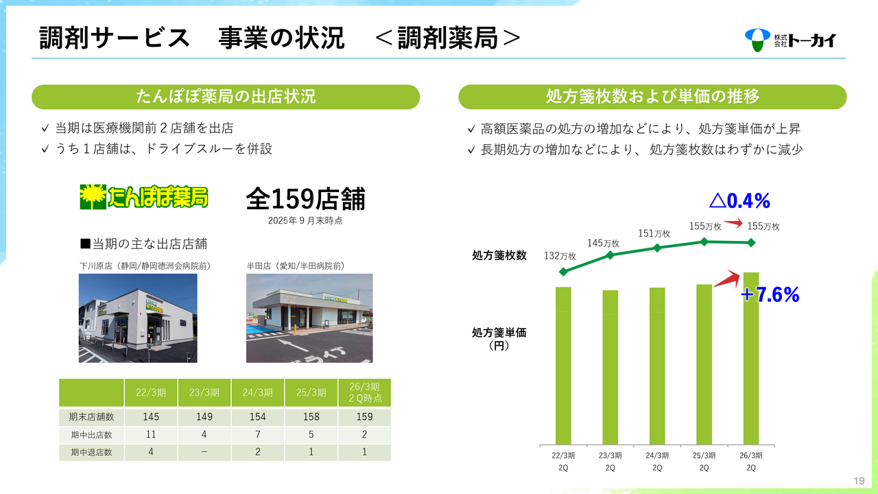 調剤薬局の新規出店については、当期に2店舗を新規出店し、1店舗を閉店しました。その結果、現在の店舗数は159店舗となっています。高額医薬品の処方が増加したことで処方箋単価は上昇しましたが、処方の長期化などの影響により、処方箋枚数は前年同期比でやや減少しています。