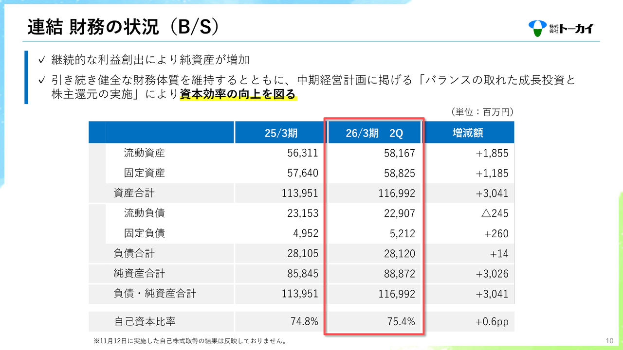 財務状況についてです。当社の強みであるレンタルビジネスを通じた継続的な利益創出により、純資産が増加しました。今後も健全な財務体質を維持しつつ、中期経営計画に沿った「バランスの取れた成長投資と株主還元の実施」を通じて、資本効率の向上を図っていきます。