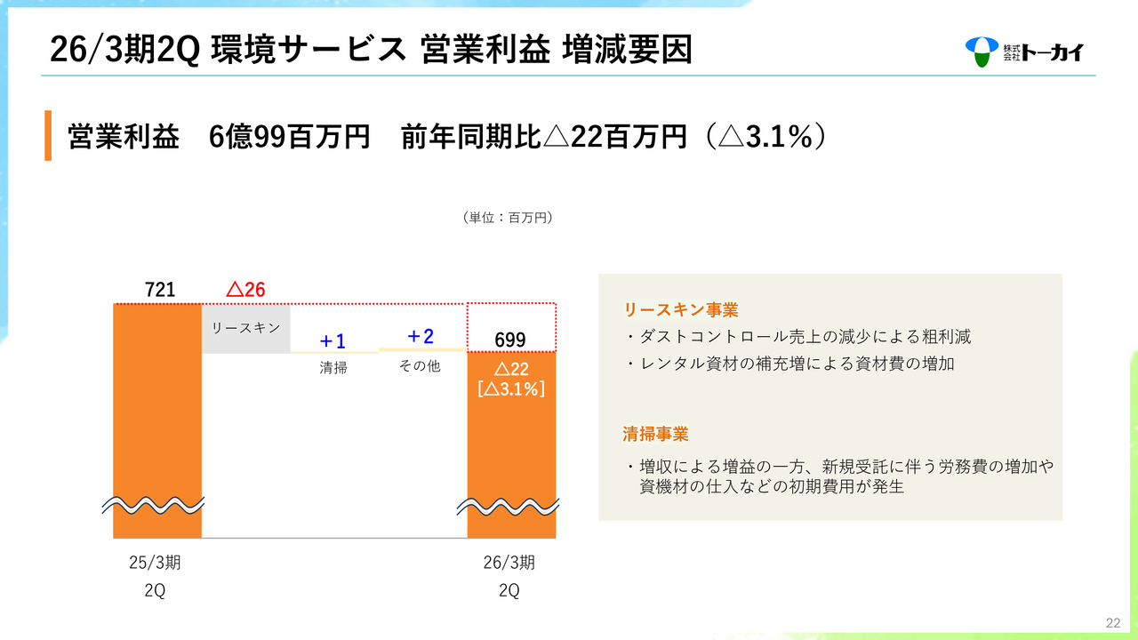 リースキン事業では、ダストコントロール商品の売上減少に伴う粗利減に加え、レンタル資材の補充が増えたことで資材費が増加し、2,600万円の減益となりました。
