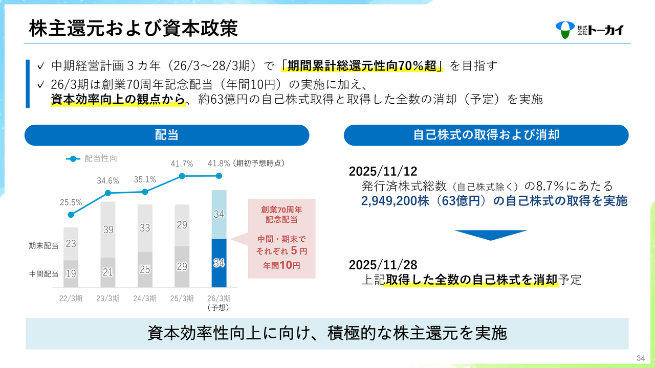 株主還元としては、「3年間累計で総還元性向70パーセント超」という方針を掲げ、2026年3月期には安定配当に加え、中間・期末で5円ずつの創業70周年記念配当を実施します。