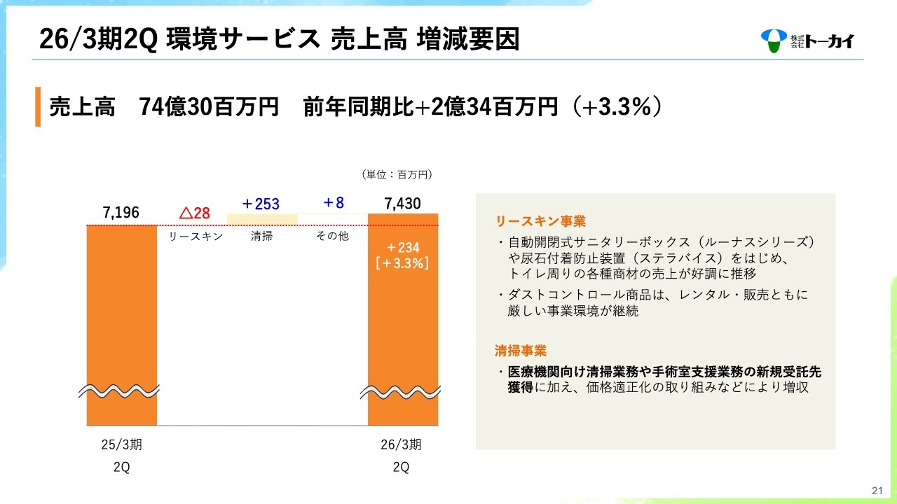 環境サービスの売上高は前年同期比3.3パーセント増の74億3,000万円となりました。リースキン事業では、自動開閉式サニタリーボックス「ルーナス」や尿石付着防止装置「ステラバイス」など、注力しているトイレ周り商品の売上が好調に推移しました。