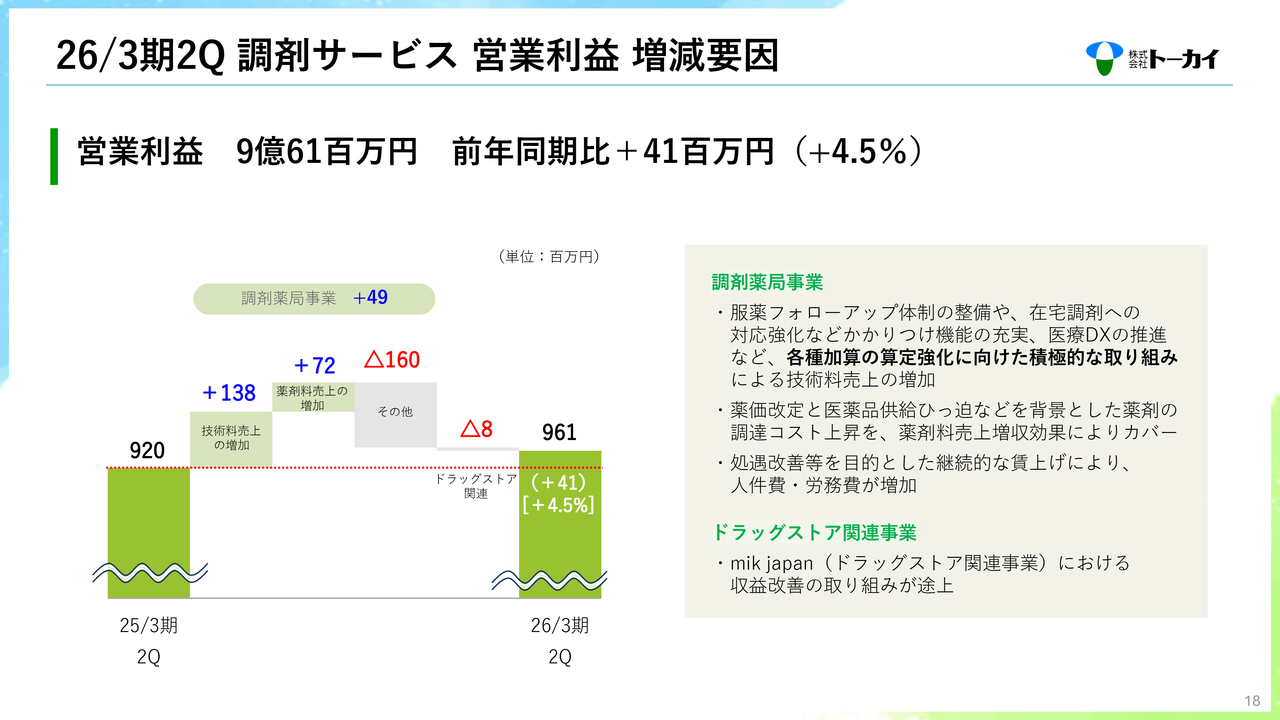 調剤サービスの営業利益は前年同期比4.5パーセント増加し、9億6,100万円となりました。調剤薬局事業では、処遇改善などを目的とした継続的な賃上げによる労務費の増加を増収効果で補い、増益を確保しました。
