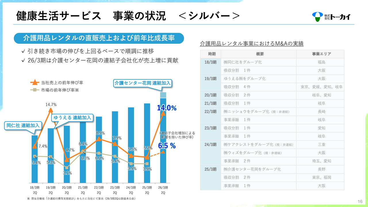 なお、介護センター花岡の連結加入効果を除いても、前年同期比6.5パーセント増と順調に拡大しています。スライド右側の表は、シルバー事業における近年のM&A実績です。成長をけん引する事業と位置づけるシルバー事業では、新規出店とあわせて、引き続き積極的なM&Aを通じた事業拡大を図っていきます。