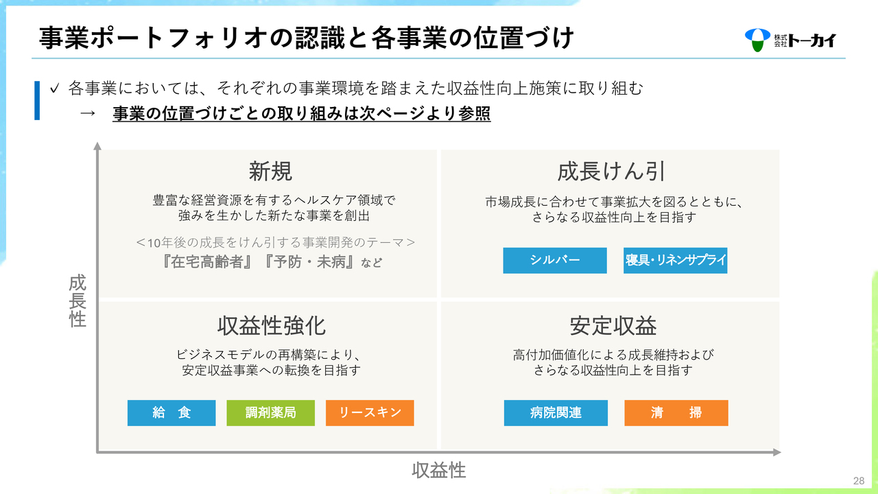 各事業の売上比率はスライドのとおりです。病院関連事業、寝具・リネンサプライ事業、シルバー事業、調剤薬局事業で、連結売上高の8割を超える規模となっています。現中期経営計画の期間中は、各事業のポートフォリオの位置づけに合わせて収益性向上を図っています。