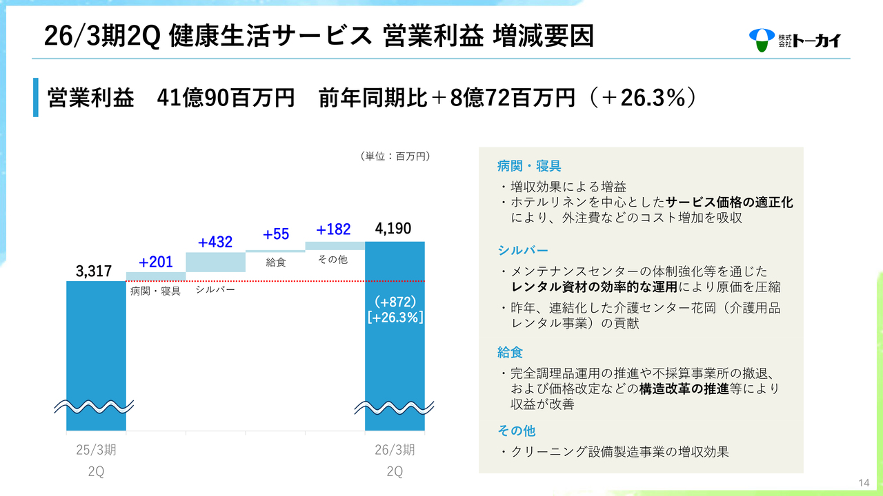 健康生活サービスの営業利益は前年同期比26.3パーセント増の41億9,000万円となりました。病院関連および寝具・リネンサプライ事業では、主にホテル向けリネンのレンタルを中心とした価格適正化を含む増収効果により、外注費などのコスト増を吸収し、2億100万円の増益となりました。