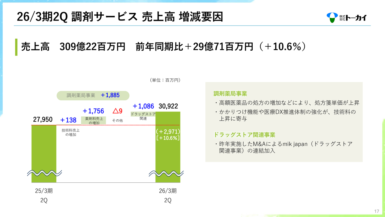 調剤薬局事業では、高額医薬品の処方増加による処方箋単価の上昇に加え、調剤報酬改定2年目となった今期は、かかりつけ機能の強化や医療DX推進体制整備加算の取得が増収に寄与しました。また、ドラッグストア関連事業では、昨年のmik japanの連結化により10億8,600万円の増収となりました。