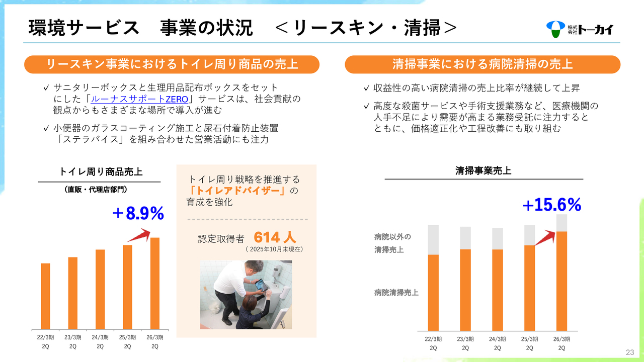 サニタリーボックスと生理用品配布ボックスをセットにした「ルーナスサポートZERO」の取り組みや、尿石付着防止装置「ステラバイス」とトイレのガラスコーティングサービスを組み合わせた営業活動により、リースキン事業におけるトイレ周り商品の売上は、前年同期比8.9パーセント増と好調に推移しました。