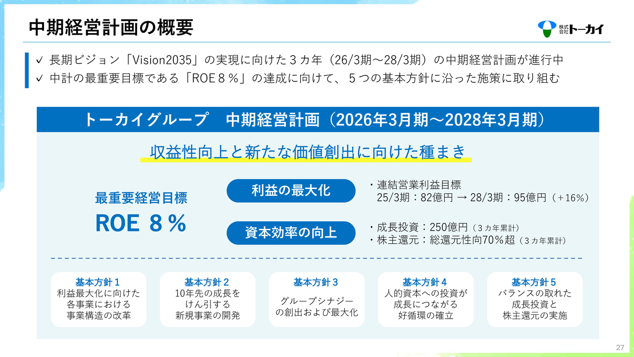 本中期経営計画では、「ROE8パーセント」を最重要目標とし、その実現に向けて5つの基本方針に沿った施策を推進しています。今回の中期経営計画は、10年後のありたい姿を描く長期ビジョンの実現に向けた「収益性の向上と新たな価値創出の種まき」の期間として位置づけています。