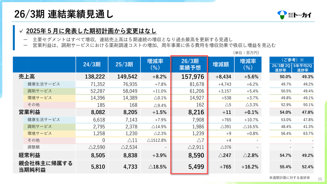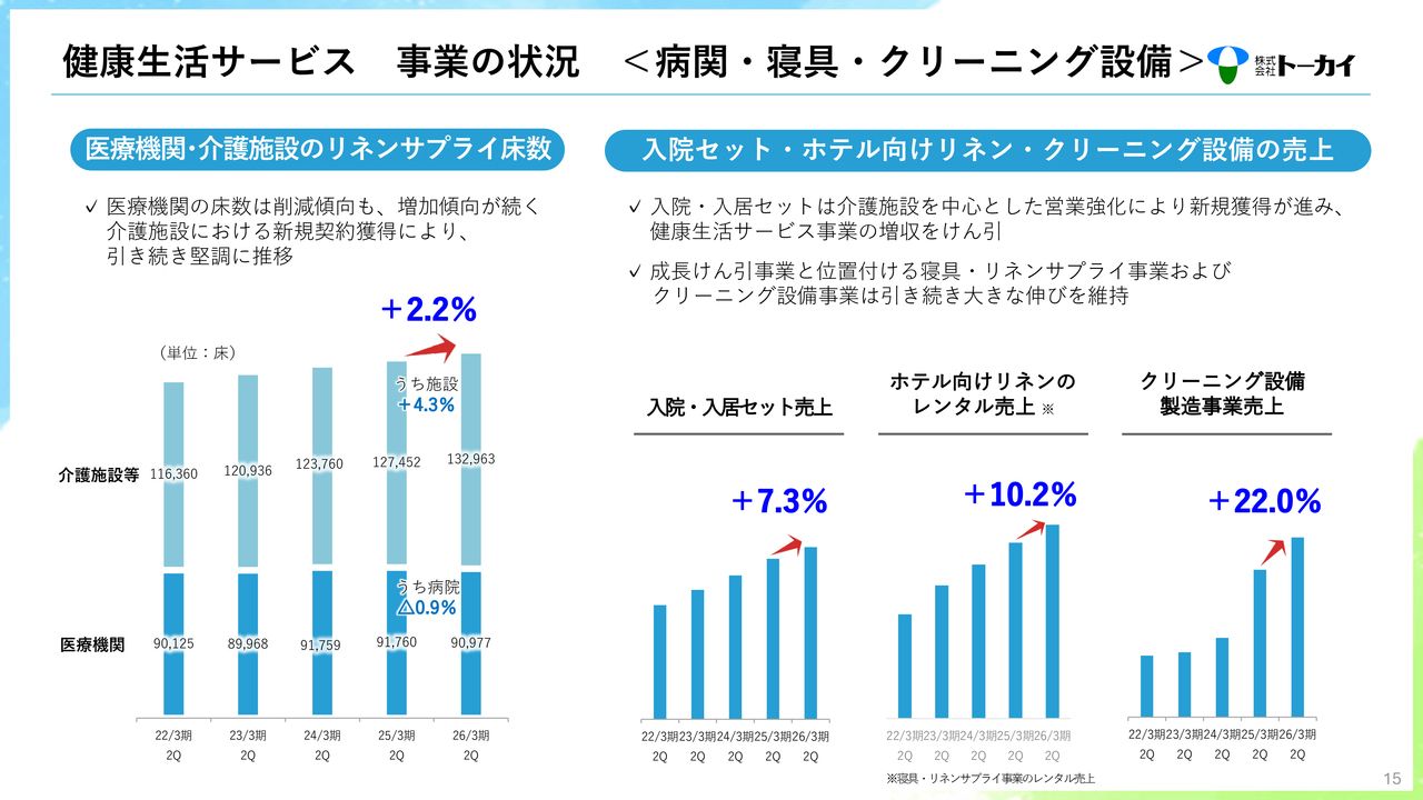 病院関連事業では、介護施設を中心とした新規顧客の獲得や、入院・入居セットの売上好調が継続しています。また、寝具・リネンサプライ事業では、ホテル向けリネンサプライの新規顧客獲得と、サービス提供価格の適正化が進展しました。