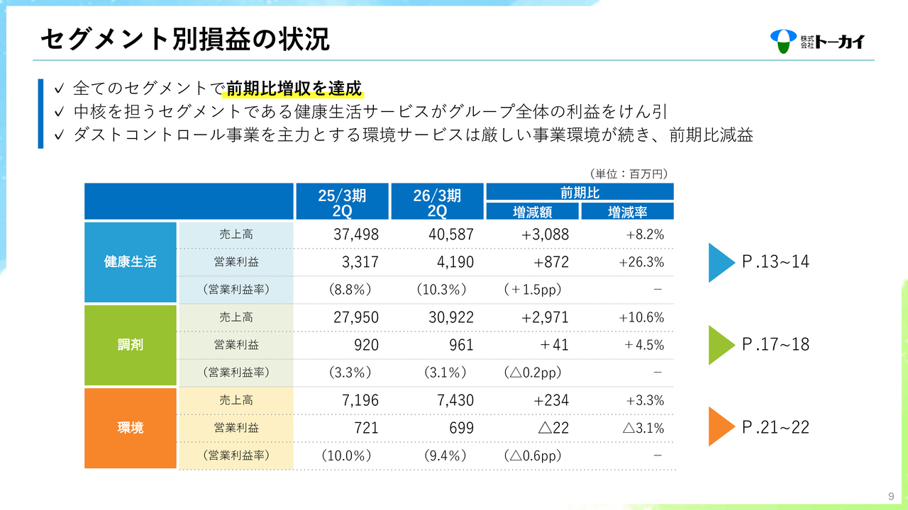 セグメント別の損益の状況についてです。売上面ではすべてのセグメントで前期比増収となり、利益面では中核を担う健康生活サービスがグループ全体の利益をけん引しました。一方で、環境サービスはダストコントロール市場の厳しい事業環境により減益となりました。セグメントごとの状況については後ほどご説明します。