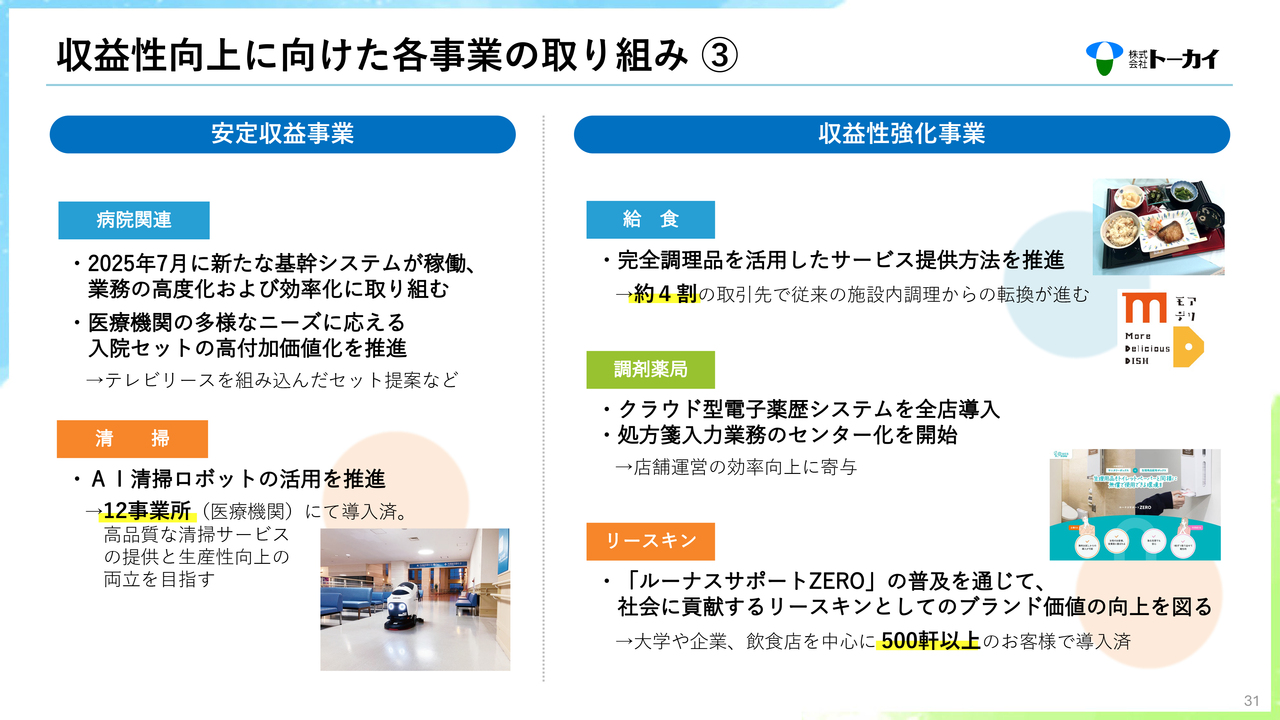 清掃事業では、収益性の高い病院清掃に注力しており、病院清掃の売上は前年同期比15.6パーセント増と好調に推移しています。医療機関の人手不足を背景に需要が高まる手術室支援業務など、院内感染管理に関するノウハウを活かし、質の高いサービスの提供を引き続き図っていきます。