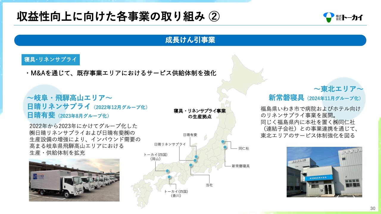 また、昨年グループ化した福島の新常磐寝具も現在は非連結子会社ですが、同じく福島県内に本社を置く連結子会社の同仁社との連携を進めており、東北エリアにおける寝具・リネンサプライ事業の体制強化を図っています。