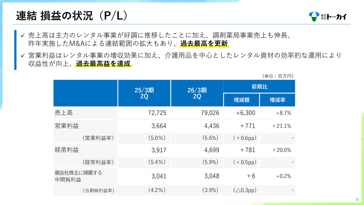 連結売上高は790億2,600万円で、前年同期比8.7パーセントの増収となりました。主力であるレンタル事業が好調に推移したことに加え、高額医薬品の処方増加により調剤薬局事業の売上も伸長しました。