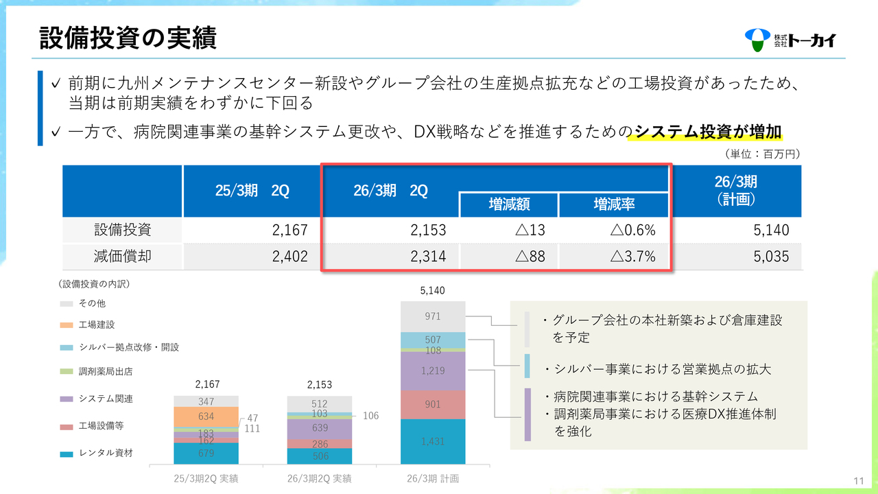 一方で、当期は病院関連事業の基幹システム更改や、DX戦略を推進するためのシステム投資が増加しています。