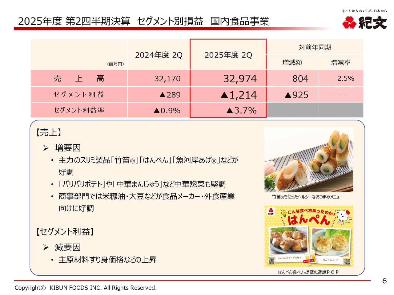 2025年度 第2四半期決算 セグメント別損益 国内食品事業