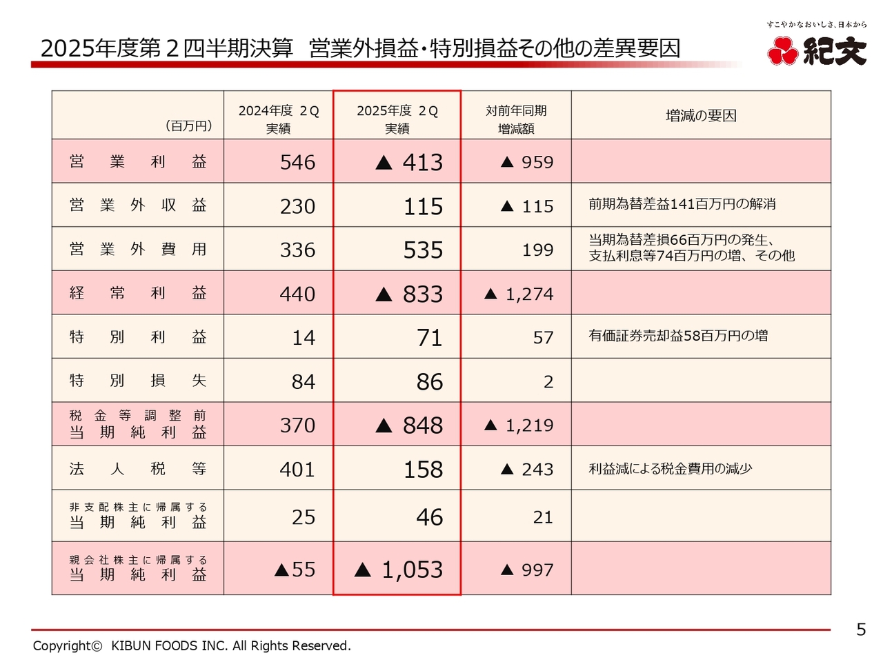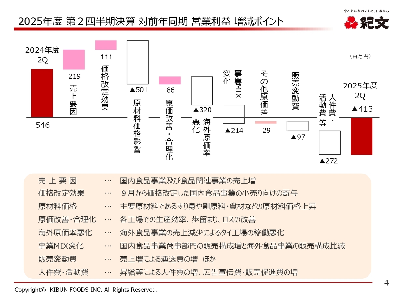 増益要因は、売上高の増加で2億1,900万円、9月に実施された国内食品事業の製品価格改定による1ヶ月分のプラスで1億1,100万円、売上増加に伴う原価改善・合理化の実施でプラス8,600万円、その他原価差でプラス2,900万円が挙げられます。