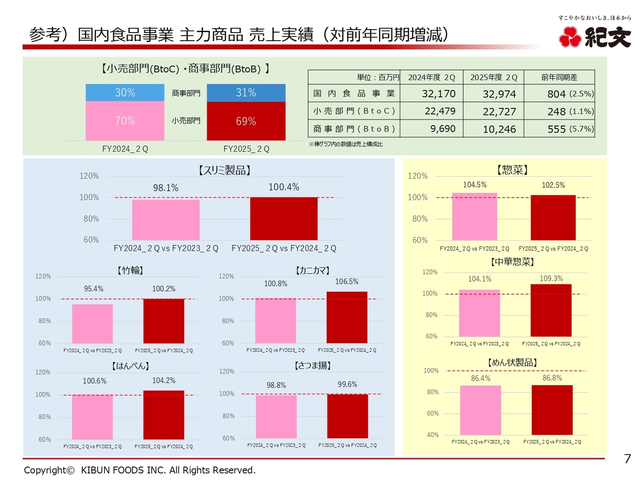 小売部門(BtoC向)と商事部門(BtoB向)の構成比は7対3で、大きな変化は見られません。小売部門(BtoC向)の製品別カテゴリの伸長率を見ると、スリミ製品は100.4パーセント、惣菜は102.5パーセント、中華惣菜は109.3パーセントと前年比を上回る結果ですが、めん状製品は前期比86.8パーセントと不調でした。