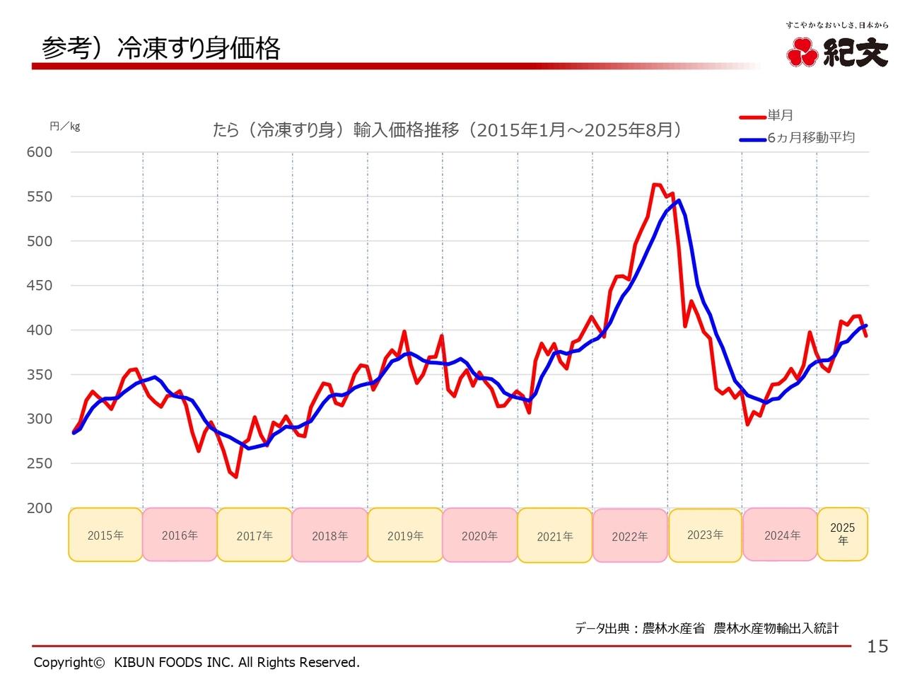 冷凍すり身の価格について補足します。先ほどご説明したとおり、いまだ上昇基調にあるため、その動向を見極めながら生産のタイミングや在庫の確保を実施し、下期にしっかりと収益をあげられる体制で今期の事業を進めたいと考えています。