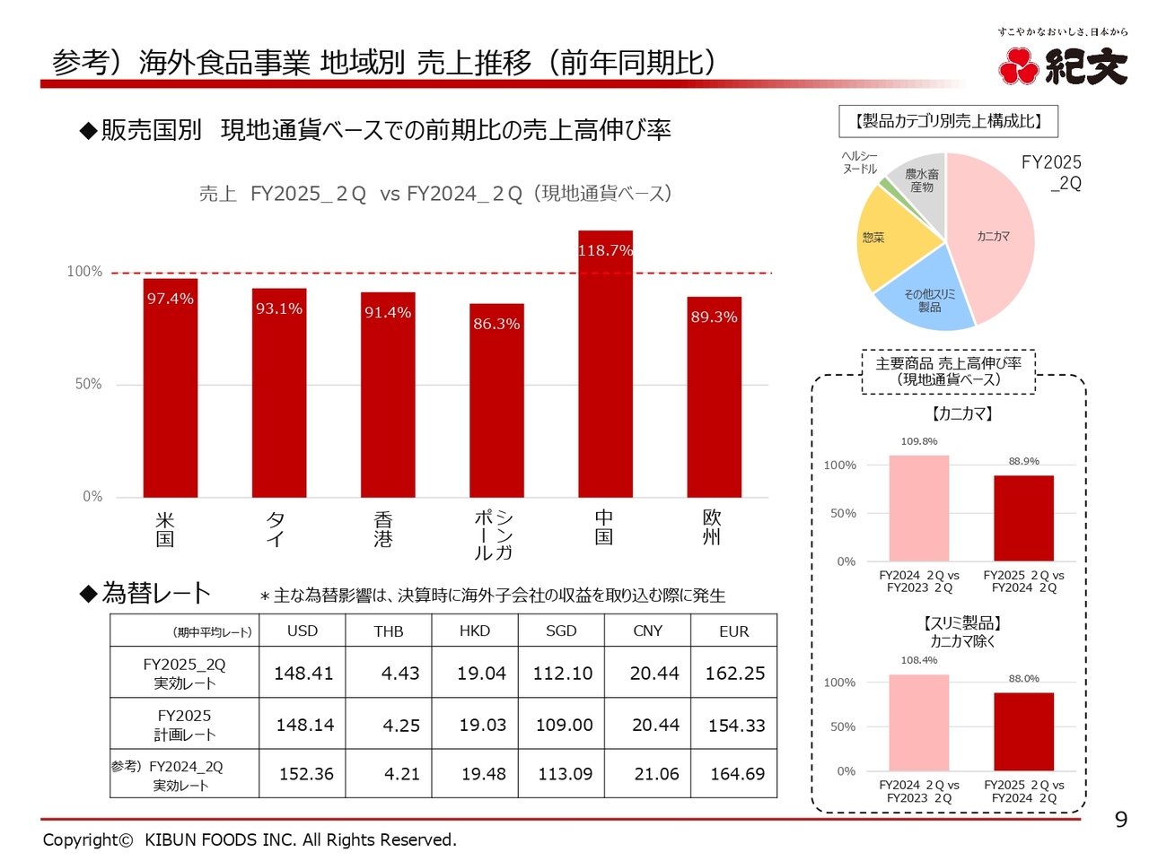また、海外食品事業については、タイから米国への関税が10パーセントから19パーセントに引き上げられた状況ですので、販売価格への反映と同時に徹底した顧客ニーズへの対応の両輪で取り組んでいきます。加えて、カニカマ以外の商品ラインナップを拡充し、販売の回復と関税の影響の吸収を進めていきたいと考えています。