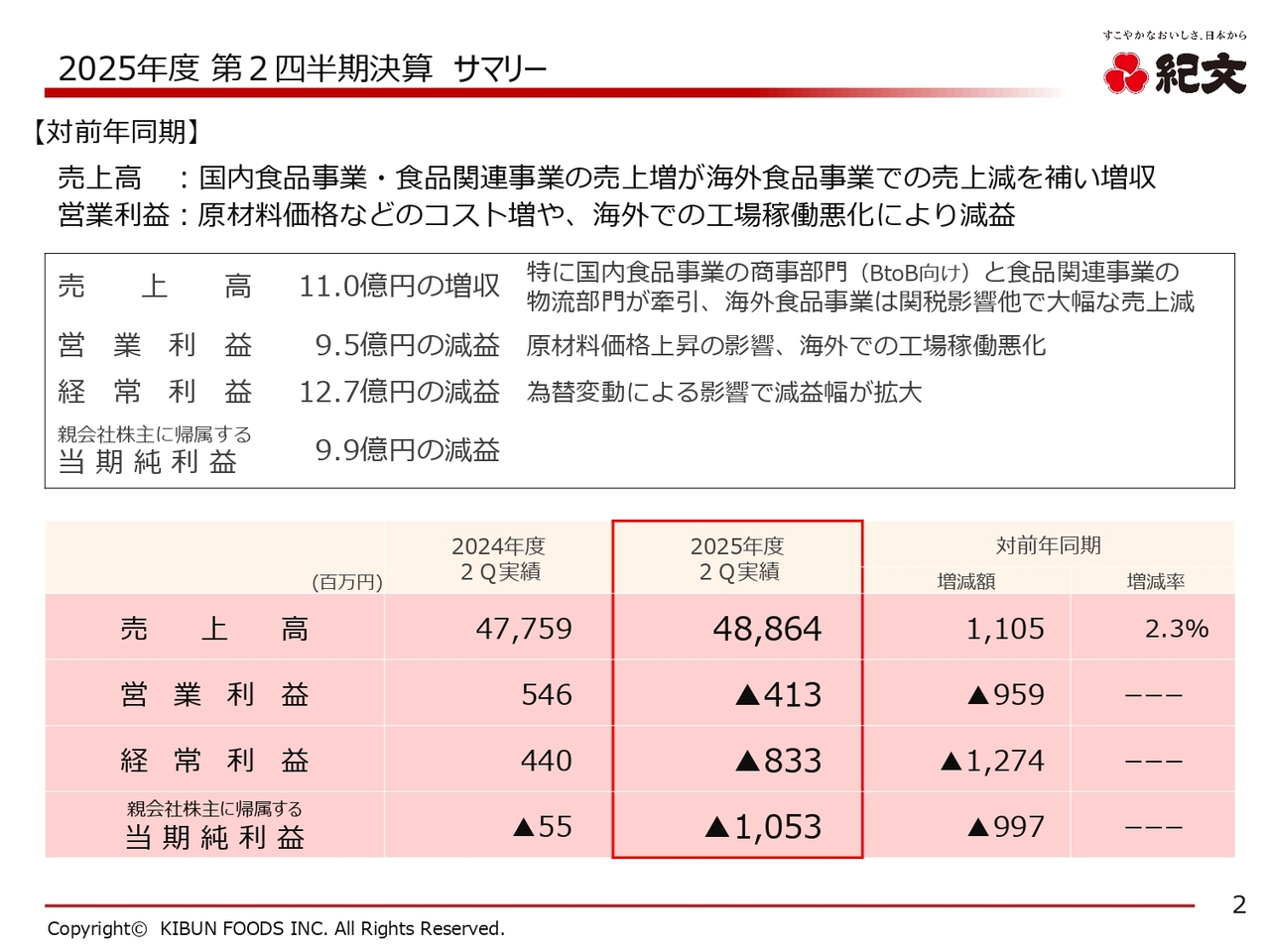 はじめに2025年度第2四半期決算の概要をご説明します。当社の第2四半期は増収減益でした。大きなポイントは、国内食品事業における原材料高騰に伴うコストの上昇、および、トランプ政権による関税政策で海外市況が大きく変化したことの2点です。