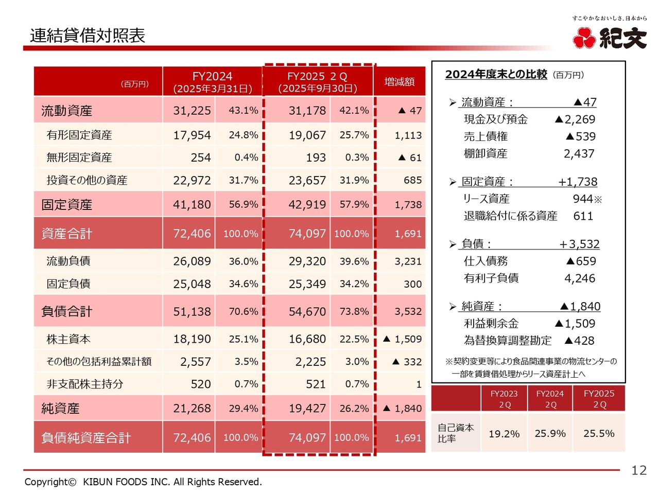 一方、リース資産は9億4,400万円となりました。ここには、紀文フレッシュシステムの一部の物件について、賃貸借契約からリース資産計上処理へと切り替えたものが含まれます。また、有利子負債については、前倒しでの生産を行っているため、通常12月に調達する資金を前倒しで借り入れした結果、増加したという内容となっています。