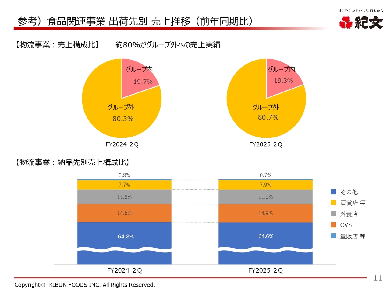 物流事業の売上構成比は、グループ内が約20パーセント、グループ外が約80パーセントで大きな変化はありません。納品先別の構成比では、量販店が約65パーセント、CVS(コンビニエンスストア)が約15パーセントと、小売向けが約80パーセントを占めています。また、外食店向けが約10パーセント、その他が約10パーセントという構成です。