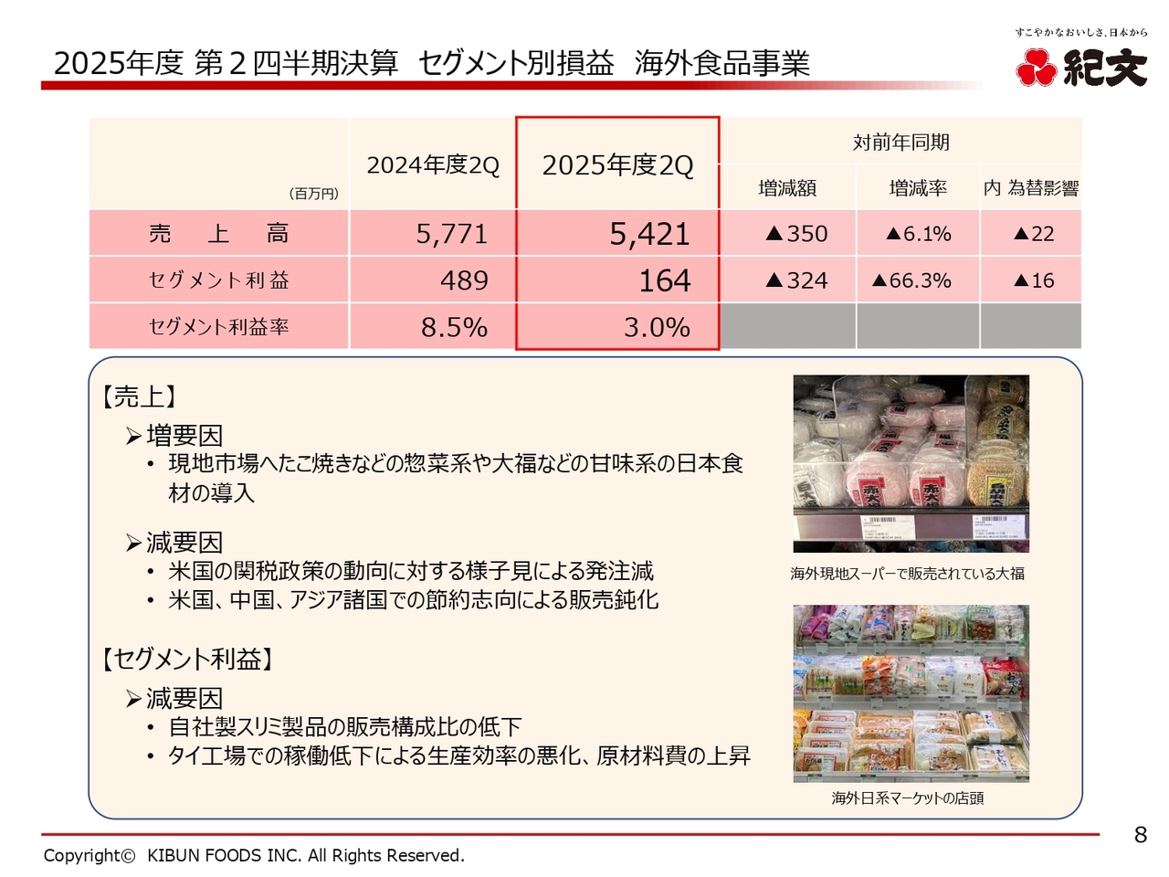 海外食品事業についてです。このセグメントは業績を大きく牽引していたものの、売上高と利益ともに減収減益となりました。米国の関税政策に対する様子見による発注減がありました。