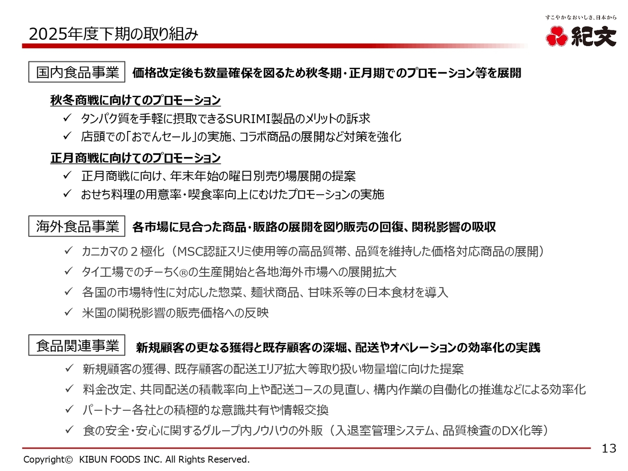 当社は上期と比べ、下期にしっかり利益を出す構造となっているため、下期の取り組みが重要です。国内食品事業については、原材料の高騰に伴い、9月から商品の価格改定を行っています。価格改定を行った後も数量をしっかりと確保するために、秋・冬・正月のプロモーションを着実に実施します。