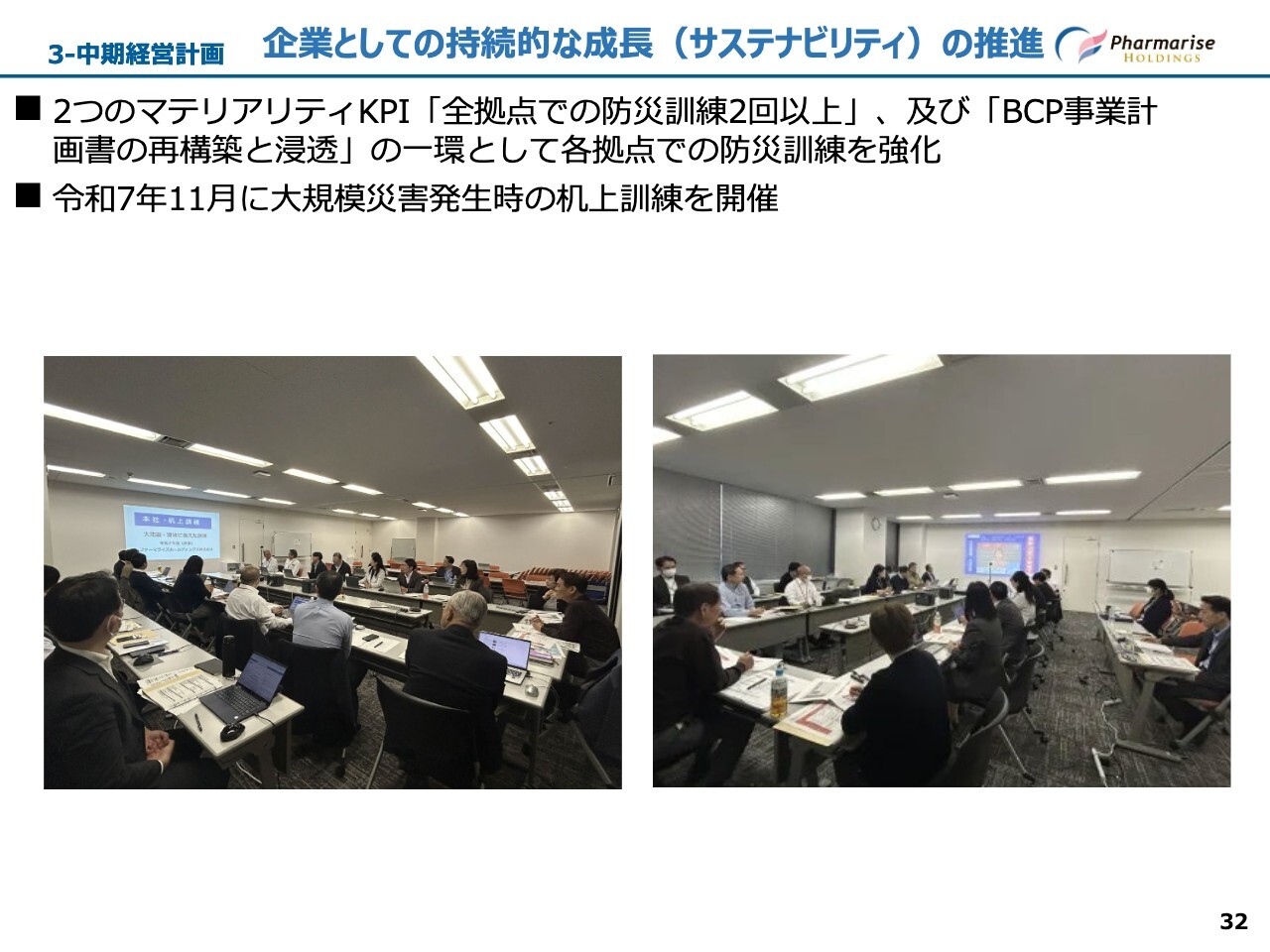 当社グループでは、マテリアリティKPIである「全拠点での防災訓練2回以上」および「BCP事業計画書の再構築と浸透」に基づき、令和7年11月に本社にて大規模災害発生時の机上訓練を実施しました。